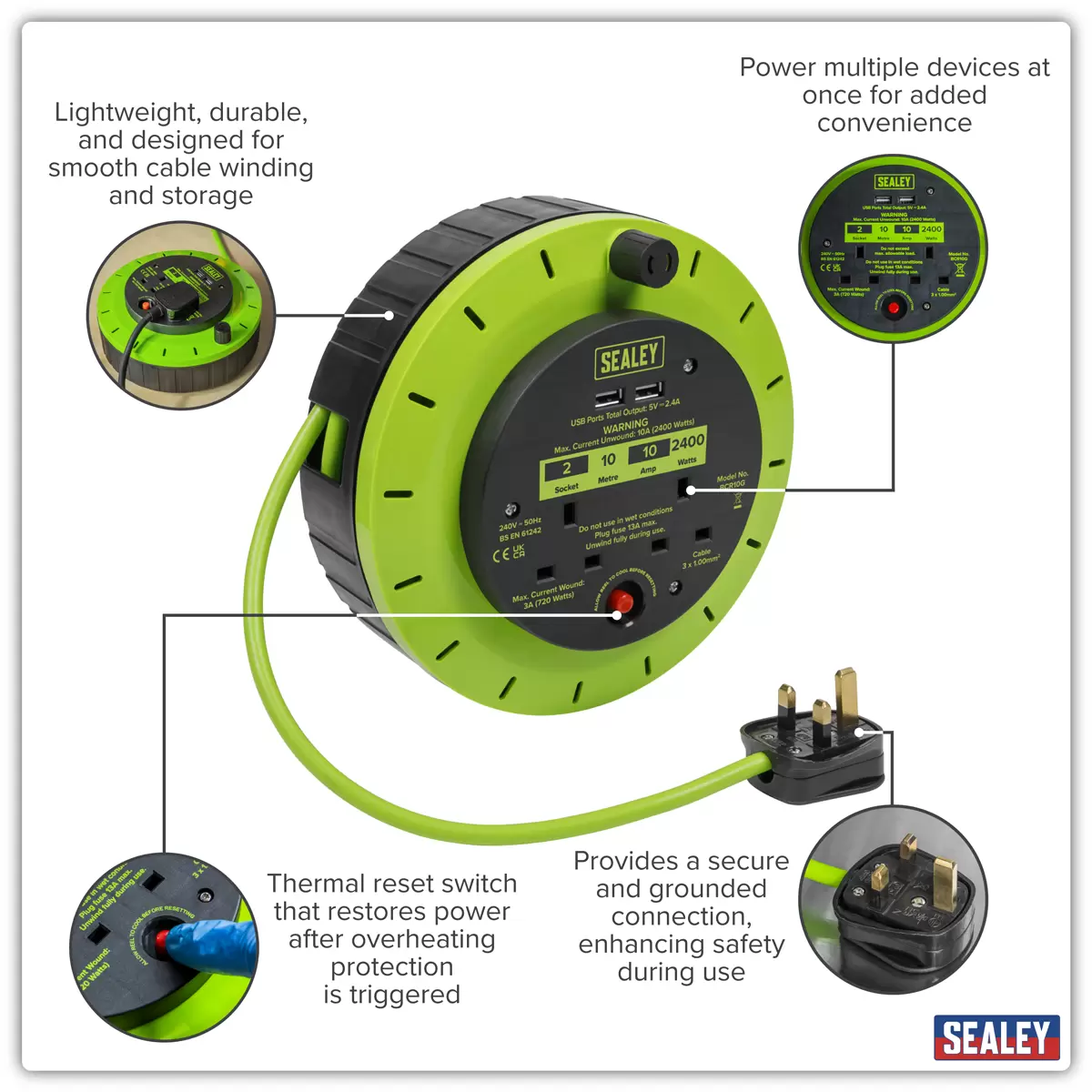 Sealey - BCR10G - 10m Cassette Type Cable Reel with Thermal Trip 2 x 230V & 2 x USB - Hi-Vis Green
