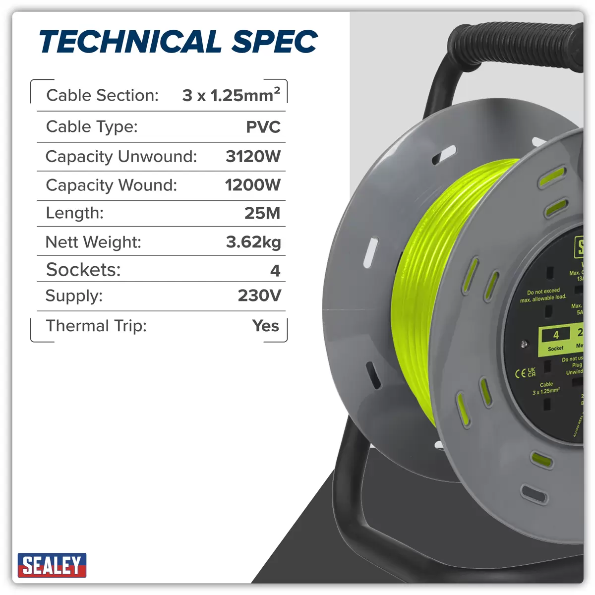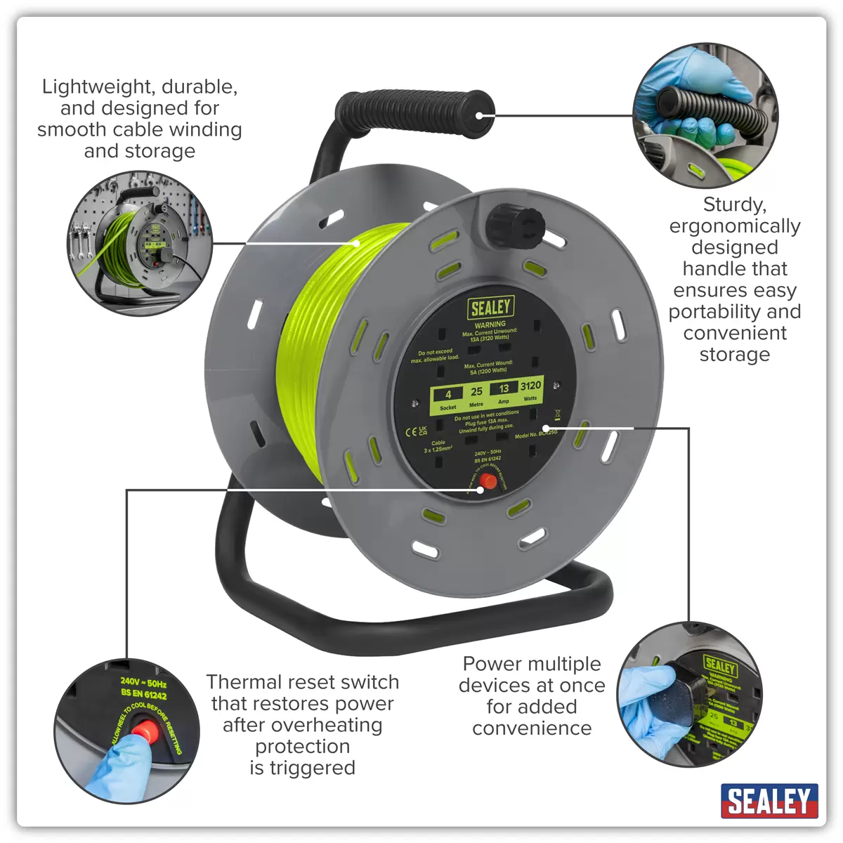 Home > Workshop Equipment > Site Power and Lighting > Sealey - BCR25G - 25m Cable Reel with Thermal Trip 4 x 230V - Hi-Vis Green