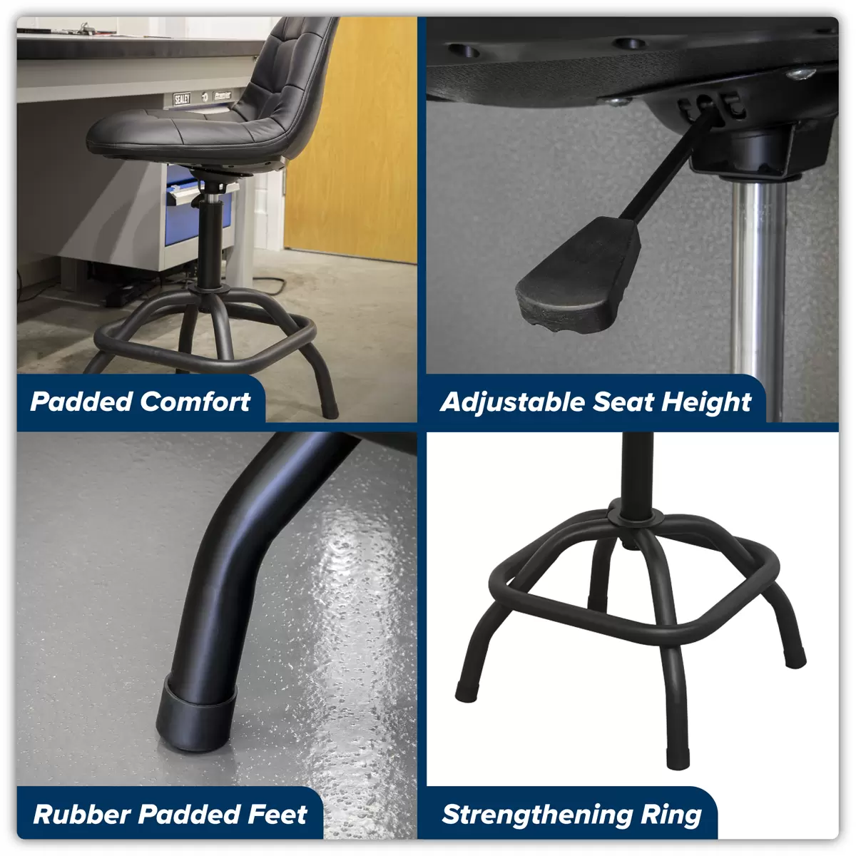 Home > Workstations / Storage > Tool Trolleys > Sealey - SCR01B - Premier Industrial Pneumatic Workshop Stool with Adjustable Height Swivel Seat & Back Rest