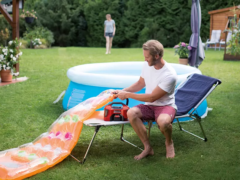 The Einhell Pressito Hybrid Air Compressor has a high-pressure pump for car/cycle tyres and balls, and a low-pressure pump/low-pressure suction function for air mattresses and rubber dinghies (6-in-1 function).