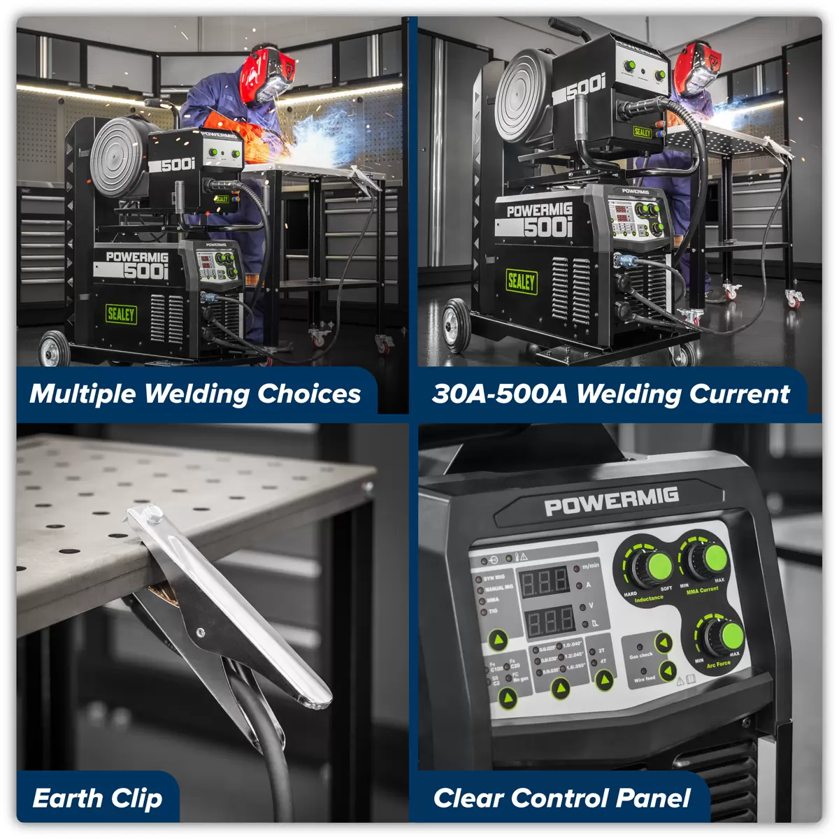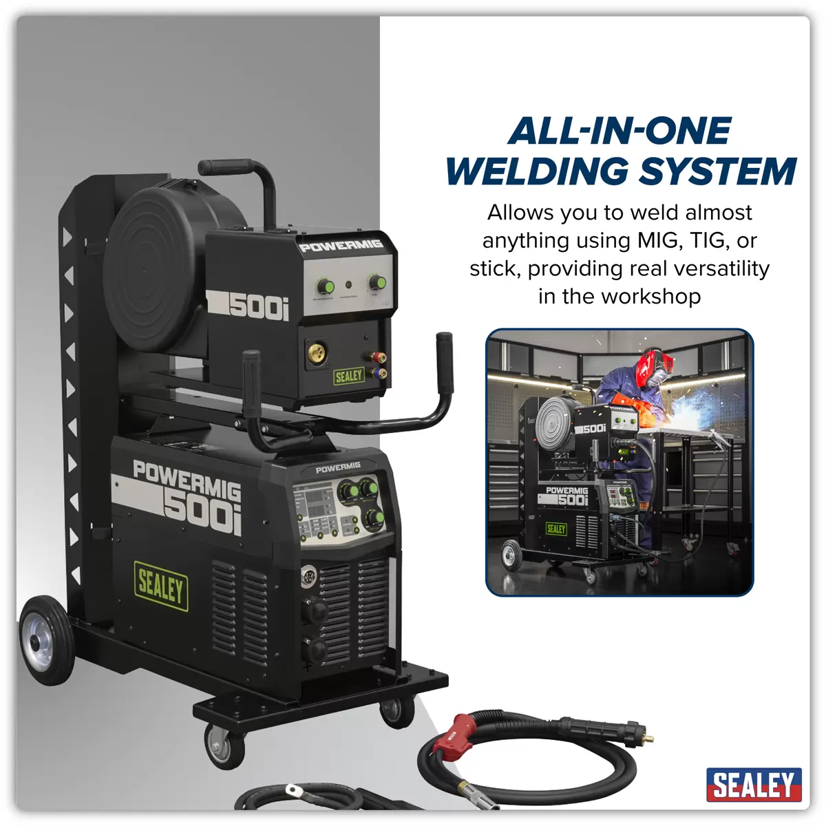 Sealey - POWERMIG500i - 500A Professional Gas/Gasless MIG/TIG/MMA Inverter Welder With Portable Wire Feeder 400V/3ph