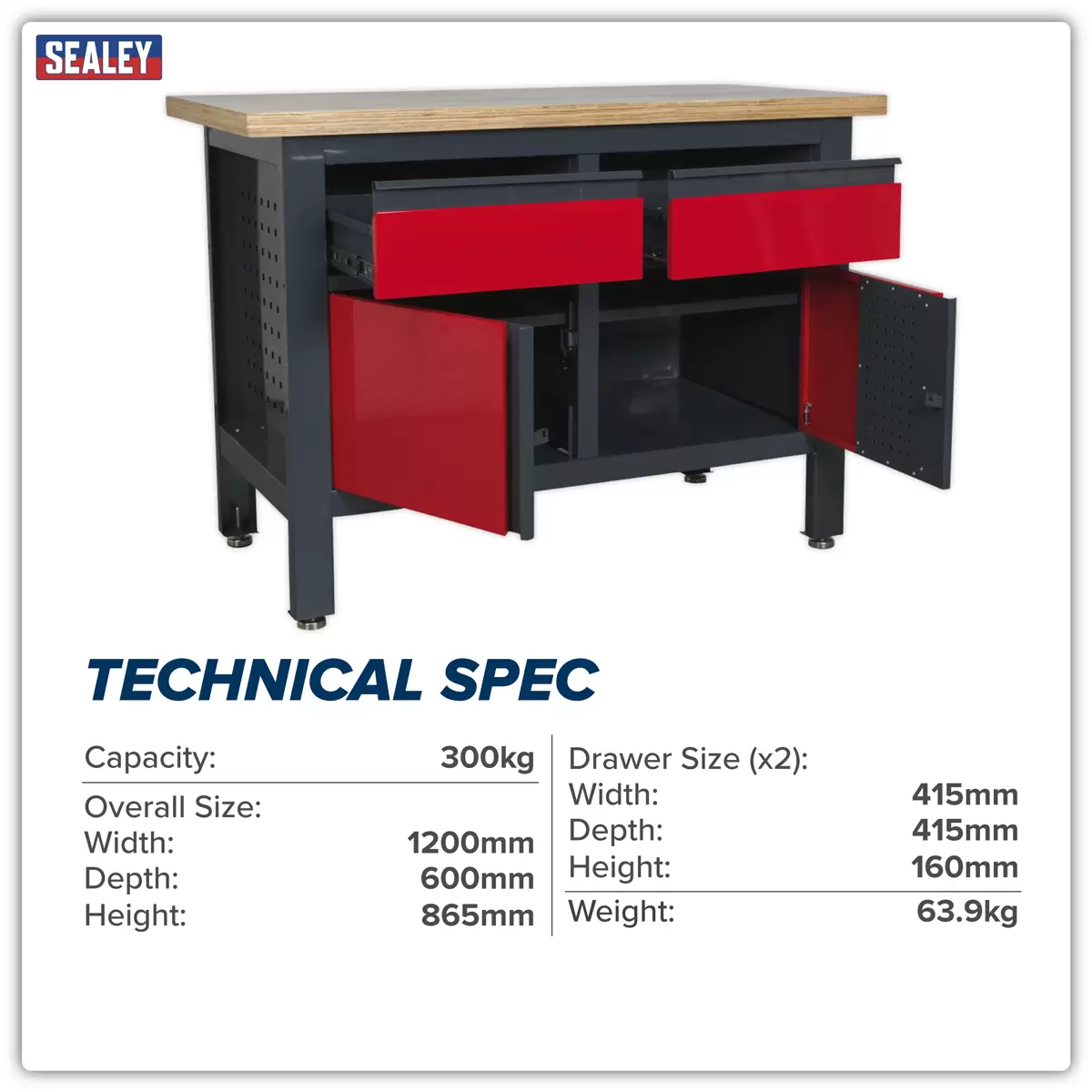 Home > Workstations / Storage > Workbenches > Sealey - AP1372A - Workbench with 2 Drawers & 2 Cupboards